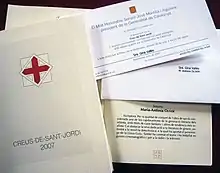The Creu de Sant Jordi (Catalan pronunciation: [ˈkɾɛw ðə ˈsaɲ ˈʒɔɾði], in English 'St George's Cross') is one of the highest civil distinctions awarded in Catalonia (Spain), surpassed only in protocol by the Gold Medal of the Generalitat de Catalunya. It was established by the Generalitat de Catalunya autonomous government by virtue of the Decret 457/1981 de 18 de desembre in 1981.[1] The medal was designed by goldsmith Joaquim Capdevila.