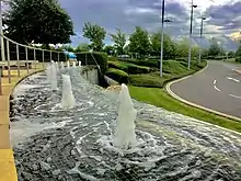 At its centre point The Mall has a large fountain with a water display. Money thrown into the fountain is donated to local charities, the company reports it raises in excess of £10,000 a year for local charities.[6][7] The fountain has many copper pipes that pump water out in repeated patterns and either into the middle, or towards the middle, where another pipe shoots water high into the air every 5–10 minutes at approximately 10 – 15 metres. The height of the water jet is adjustable to prevent any object, hanging from above, from getting wet; additionally there are also a few other decorative fountains outside the main entrance.