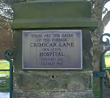 In 1955 the Board recommended that Crimicar Lane should no longer be used as a hospital and the tuberculosis Huts were demolished at that time.[2] All patients were transferred to Lodge Moor Hospital on 31 May 1956.[1] The hospital stood empty for some time before the remaining buildings were demolished to make way for the housing which now stands on Westminster Crescent. All that remains of the old hospital are the perimeter wall and the main gates which have a memorial plaque attached to them.[1]
