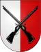 The blazon of the municipal coat of arms is Per pale Argent and Gules, overall two crossed Rifles saltirewise Sable lined of the first.[6]