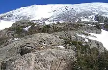 Cristo Couloir, Quandary Peak, is a 2,575 feet (785 m) couloir located on Quandary Peak that stretches from the Blue Lake Dam to the summit at 14,265 feet (4,348 m). It is a popular ski mountaineering descent in the spring climbing season (April through June, depending on weather and snow conditions). The ascent can be accomplished by an experienced mountaineer in 3–5 hours and the ski descent in 1–2 hours. Cristo Couloir is actually closer to one mile in length with elevation gain of over 2,000 ft . The ascent from the base parking lot below the dam is about a mile and 1/2 with a total elevation gain of approximately 2,500 ft.