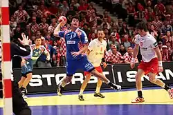 Croatia has often been portrayed[1] as an international force in handball, having won two Olympic gold medals and one World Championship, but never winning the Euros, having lost three finals, one to rivals France, one to Denmark, and one to Spain. The Croatian national team that won the 1996 Olympic gold medal was often credited as the biggest upset in history of handball, with handball making its debut appearance.[2] The Croatian national team won a so-called "international double" after winning both the gold medal at the Olympics (2004) and the World Championship (2003), beating Germany in both finals.