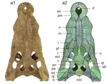Specimen sn813/lj represents a mesorostral skull with a length of 47 cm (19 in) from the tip of the snout to the end of the supraoccipital. Most of the skulls surface is heavily ornamented by a dense network of pits and ridges, however despite the very visible ornamentation, most of the finer detail of the skull sutures is obscured by a thin layer of sandy crust. Like other crocodiles, C. checchiai shows a marked constriction behind the external nares where the premaxilla and maxilla connect, making room for an enlarged dentary tooth. The first two dentary teeth are also slightly enlarged, piercing the premaxilla and creating two small holes visible even when viewed from above. The fifth maxillary tooth is likewise enlarged to the point that the maxilla bears a notable convex bump around its root, visible both when viewed from the top and the side. The upper jaw houses a total of eightteen teeth, five in each premaxilla and 13 in each maxilla, arranged in a relatively linear fashion. All teeth of the upper jaw are consistent in shape, with relatively slender shape. In contrast, the teeth show more variation with slender teeth towards the tip of the snout and more stout teeth further back. The lacrimals are larger than the prefrontals and broadly contact the nasal bone without the maxilla inserting itself between the two bones. The external nares are elongated and surrounded mostly by the premaxilla, with a small portion of its posterior edge presumably being composed of the nasal bone (however this ara is broken and thus not certain). The orbits are large with a nearly circular ventral margin. The infratemporal fenestrae are smaller, but damaged to breakage towards the back, where the quadratojugal lamina would be. The most notable feature of C. checchiai however is the swollen rostral boss that covers most of the nasals as well as parts of the lacrimals, prefrontals and anterior-most tip of the frontal bone. This type of structure is typical for the neotropic radiation of Crocodylus, such as the American Crocodile, and unheard off in any other African or Indopacific species of the genus.[4]