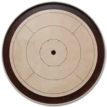 Board dimensions vary with a playing surface typically of polished wood or laminate approximately 26 inches (660 mm) in diameter. The arrangement is 3 concentric rings worth 5, 10, and 15 points as you move in from the outside. There is a shallow 20-point hole at the center.[1] The inner 15-point ring is guarded with 8 small bumpers or posts. The outer ring of the board is divided into four quadrants. The outer edge of the board is raised slightly to keep errant shots from flying out, with a gutter between the playing surface and the edge to collect discarded pieces. Crokinole boards are typically octagonal or round in shape. The wooden discs are roughly checker-sized, slightly smaller in diameter than the board's central hole, and typically have one side slightly concave and one side slightly convex, mainly due to the inherent features of wood, more than a planned design. Alternatively, the game may be played with ring-shaped pieces with a central hole.