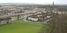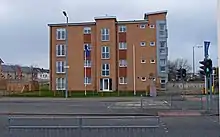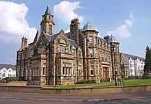 In 1895, a lunatic asylum and hospital (known initially as Govan District Asylum, then as Hawkhead Asylum after the surrounding country estate on the periphery of Paisley) was built on a promentory near the left bank of the White Cart to the west of Crookston Road.[21][1][22] It was expanded several times, including the incorporation of the old Hawkhead mansion and a farm for use by inmates,[1][23][24] and was re-named Leverndale Hospital in 1964.[25][26] In that period there was a separate Hawkhead Hospital located across fields to the west of Leverndale,[1] another psychiatric facility south of that at Dykebar Hospital,[21] and another hospital a short distance to the east at Cowglen.[22] New buildings closer to the main road were constructed in the 1990s, and in the 2000s the older units (including the Category A listed Towerview Unit were converted to private housing.[1] In 2011, a station for the Scottish Ambulance Service opened at the new Leverndale site,[27] followed in 2014 by the NHS West of Scotland Mother and Baby Unit (relocated from the Southern General Hospital).[28]