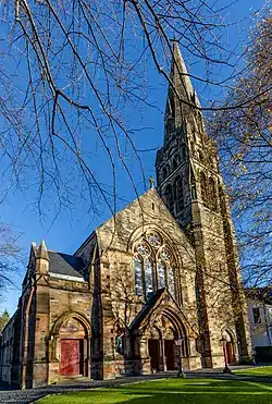 The building was founded as Queen's Park Established Church.[1] It was built in the French Gothic style between 1872 and 1873 on designs by Campbell Douglas and James Sellars. A steeple was also built of Franco-German inspiration, with an octagonal stone spire. The church was completed and opened on 12 October 1873.[2]