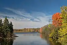 There, the Crowe River passes over Marmora Dam,[2] heads southwest into the township of Stirling-Rawdon, passes over two one-metre (3 ft 3 in)-high and 40-to-60-metre (131 to 197 ft)-wide falls at Callaghan's Rapids Conservation Area,[4] enters the municipality of Trent Hills in Northumberland County, flows over Allan Mills dam,[2] passes over several falls at Crow Bridge Conservation Area,[5] and reaches its mouth at Crowe Bay on the Trent River, just upstream of the Trent–Severn Waterway Crowe Bay lock and dam. The Trent River flows to the Bay of Quinte on Lake Ontario at Trenton.[6]