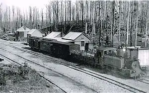 At the Up end of the yard, an Annett-locked loco siding facing the yard had two ash pits, a water stand-pipe and an engine shed.[3] Two timber station buildings, separated by a waiting shelter, provided passenger and staff accommodation. A van-goods shed was located at the Down end of the platform.