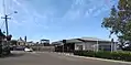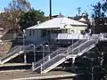 The existing overhead booking office is located on the footbridge. The building is constructed of pre-cast concrete panels which furnish the appearance of timber weatherboard construction and a hipped roof with a transverse gable in corrugated metal sheeting.[2]