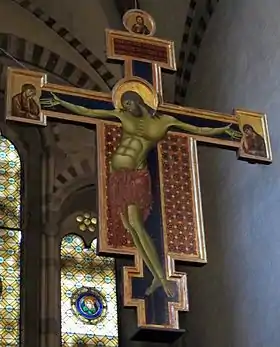 The Crucifix by Cimabue at Arezzo is a large wooden crucifix painted in distemper, with gold leaf, by the Florentine painter and mosaicist Cimabue, dated to c. 1267–71. It is the earliest of two large crucifixes attributed to him.[1] It shows a painted representation of the near dead body of Christ on the cross, with Mary, mother of Jesus and John the Evangelist at either end of the cross beams.