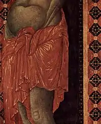The saints are painted with bright coloured hues, with gold highlights along the lines of their clothes (this gilding is absent in the more austere Santa Croce panels).[5]
