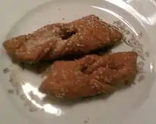 A cruller (/ˈkrʌlər/) is a deep-fried pastry like a doughnut popular in the US and Canada often made from a rectangle of dough with a cut made in the middle that allows it to be pulled over and through itself, producing twists in the sides of the pastry. The cruller has been described as resembling "a small, braided torpedo".[1] Some other cruller styles are made of a denser dough somewhat like that of a cake doughnut formed in a small loaf or stick shape, but not always twisted.[2] Crullers may be topped with powdered sugar (sometimes mixed with cinnamon) or icing.
