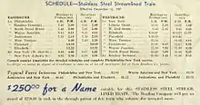 A contest was held to find a name for the new train, offering a $250 cash prize (equivalent to $4,712 in 2021) to the winner. The Crusader, the entry of Mr. P. W. Silzer of Plainfield, New Jersey, won the prize, selected by a committee of 29 railroad officials from among 6,086 suggestions.[6] The Crusader's first regular run was on December 13, 1937.[3] The train was scheduled to make two round trips six days a week; Sundays were reserved for maintenance work.