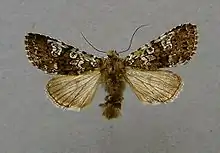 C. gemmea Tr. (32 f). Superficially resembling L. viridana, the ground colour being the same olive- brown and the markings black and white; the orbicular stigma, however, is always round, not irregular in shape; the claviform of the ground colour, black-edged, sometimes with a few whitish scales in it, and of the ordinary shape, not triangular; the costal area is sprinkled with white scales; submarginal line white, preceded by black dentate marks; fringe brown with fine white chequering; hindwing in both sexes brownish grey, paler towards base, with cellspot and veins dark. Larva glossy bluish or greenish grey; tubercles black carrying a single pale hair; head, thoracic, and anal plates black brown.[1] The length of the fore-wings is 16–20 mm.