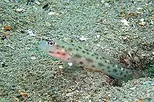 Ctenogobiops tangaroai, the silver-spotted shrimp-goby, is a species of bony fish of the family Gobiidae, native to the reefs which is widespread in the Indo-West Pacific, from the Red Sea and Western Indian Ocean through northern Australia and Taiwan, southern Japan and Fiji.[2] It occurs in fine-grained sand patches at depths of from 4 to 40 metres (13 to 131 ft) where it is commensal with alpheid shrimps, with a fish and shrimp sharing a burrow. This species can reach a length of 6 centimetres (2.4 in) TL. It can also be found in the aquarium trade.[3] It is pale in colour marked with four rows of brown spots or dashes along its flanks, three diagonal rows of short, dark stripes on the posterior of its head with larger dark spots on the lower flanks which are frequently surrounded by smaller blue spots and there is a small white stripe above the pectoral fin base with a longer white streak on the pectoral fin.[2] It is the type species of the genus Ctenogobiops.[4]