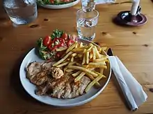 Cube steak or cubed steak is a cut of beef, usually top round or top sirloin, tenderized and flattened by pounding with a meat tenderizer. The name refers to the shape of the indentations left by that process (called "cubing").[1] This is the most common cut of meat used for the American dish chicken fried steak.