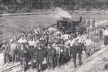 On 18 January 1909, a test run on the line was undertaken in order to check it technically. The train being used for the test arrived at Elmstein station at 11 am. The official inauguration took place five days later.[11] The first train was due to depart Elmstein at 6.20 am. However, as it was about to leave there was a fatal accident. The Jungfern service was just a few metres from the end of the line when, owing to a wrongly set turnout, the train accelerated at full steam into the locomotive shed and killed a spectator. The locomotive escaped with only a few scratches; the shed, however, suffered more serious damage that had to be repaired. As a replacement, a train from Lambrecht arrived at the end of the section at 8.15 am; around 10 am the first train finally left Elmstein for Lambrecht.[12]