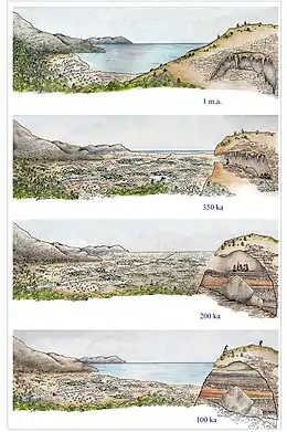 Archaeologists recognize a stratigraphy of 17 layers, dated between 350 and 121,000 years ago.[1] Three main periods of occupation are recognized: 350,000 years ago, 200,000 to 150,000 years ago, and 120,000 years ago.[4] Human occupants ate a wide variety of animals,[5] including ungulates of all sizes,[1] besides tortoises[6] and birds.[7] Throughout the occupation, they ate young elephants.[1] A relative rarity for the Middle Pleistocene is the frequency with which the remains of rabbits, marked with cuts, are found; such small, quick prey is unusual for the period, and is most likely a specific feature of a unique locality.[8]