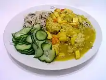 The meal begins with seafood, usually pickled herring, or another herring dish. The cured and pickled herring fillets are typically made and served in a white and a red variety, but a multitude of pickled herring dishes exists.[26][27] White herring has marinated in a clear, sweet and mildly spiced vinegar marinade while the sharper tasting red herring has marinated in a red, seasoned vinegar marinade, owing their red colour to sandal wood.[28] Other common variations includes a variety of sour cream-based sauces, of which a curry flavoured type is very popular. Spegesild is usually served on buttered, black rye bread, topped with onion rings, pickled capers and a glob of curry salad - a sour-cream based sauce, flavored with curry and chopped pickles - and chopped hard boiled eggs on the side. Alternative, but common, herring dishes served at the cold buffet includes stegte sild i eddike (fried herring in vinegar) consisting of rye-battered, fried fillets of herring in a spiced vinegar marinade or the more elaborate silderet (herring dish) where the herring is arranged in a large serving dish with various sides such as warm, boiled potatoes, raw onion, pickled capers and a dill-flavoured sour-cream or mayonnaise sauce, or diced apple, shredded horseradish and curry salad, as two common options.[29][25] Other seafood dishes may include:[30]