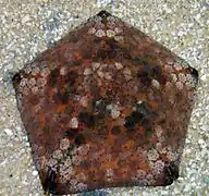 A mature C. novaeguineae is pentagonal to subglobose in shape with an inflated appearance and much-abbreviated arms. It can grow to a diameter of 30 cm (12 in). Rows of tube feet are on the underside, and it has a central mouth. The colour is very variable and includes a mottling with darker and lighter shades of fawn, brown, orange, yellow and green.[3] The armoured body wall is made of calcareous ossicles which are supported internally by pillars which buttress the ambulacra. The armouring contains pits into which the tube feet can be retracted. The body cavity is filled with water.[4] On the dorsal face, they can be covered with small conical tubercles, as well inside as outside of papular areas.[5]