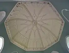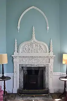 The tower is octagonal on a square base, with a staircase projecting on the west side. The windows are pointed, and there is a band of blind ogee arches between the first and second floor windows. Inside there are two main rooms, each occupying a whole floor, and thus octagonal.The first floor room has rich Gothick ornamentation, in particular the chimneypiece. The room has a domed plaster vault. The second floor room is more classical in its detail.[2]
