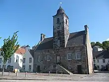 The town house was commissioned to replace an earlier tolbooth on the same site.[1] It was designed in the Scottish medieval style, built in sandstone and was completed in 1626.[1][2] The design involved a symmetrical main frontage of five bays facing Back Causeway; there was an external double forestair containing a blind oculus leading up to a central doorway with a rectangular fanlight on the first floor. The staircase was flanked, on the ground floor, by two small windows and, beyond that, by two small doorways. The first floor was fenestrated with four square-headed sash windows.[1] A three-stage clock tower was installed in 1783: the first stage involved a round headed window, the second stage featured a clock designed and manufactured by Laurence Dalgleish and the third stage featured a louvered opening. The whole structure was surmounted by a cornice, an ogee-shaped dome and a weather vane. Internally, the principal rooms on the first floor were a council chamber (on the west side) and a reception room (on the east side) and a debtors' prison; the ground floor was occupied by cells for the incarceration of criminals.[3] It is likely that Lilias Adie of nearby Torryburn was among the many women accused of witchcraft who were held in the cells.[4][5]