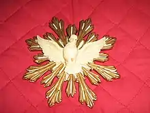 Also, referred to as the cortège, império or mudança (English: the move); on Easter day, the crowns are transported to the church, where they are placed on the altar, until the end, when they ceremonially crown the recipient (coronation). The emperor will then depart for his home, accompanied by his cortège and the brotherhood, and led by the Holy Spirit's standard, the foliões, the crowns surrounded by the poles (in a rectangular form) and trailed by the faithful. Normally, a band will follow the cortège with cheerful processional music, although they may be accompanied alone by the Foliões of the Divino. Upon arriving at the emperor's home, the crowns are placed on an altar of honour of wood and adorned with white paper and flowers, to remain throughout the week. Every evening the neighbours and faith community gather at the home where traditionally some food and dancing may have occurred, but usually ends with the recitation of the rosary and benedictions to the Holy Spirit. On the following Sunday, the crowns depart once again with the cortège for the church, where they are received by the local parish priest, who recites the Magnificat (a traditional pastoral benediction). The process, traditionally, repeats itself until the seventh Sunday following Easter (referred to as the Domingo do Bodo), and in some cases until the eighth Sunday following Easter (traditionally referred to as the Segundo Bodo or Domingo da Trindade).[9] The modern tradition, influenced by religious immigrants, is shortened to include a brief cortège procession (usually on the same day of the coronation), and ceremonial transfers of the crown to the home of the emperor, all performed throughout the summer.[10]