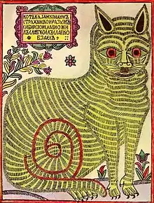 Eighteenth century folk art, Cat of KazanUnlike Western countries, cats have been considered good luck in Russia for centuries. Owning a cat, and especially letting one into a new house before the humans move in, is said to bring good fortune.[22] Cats in Orthodox Christianity are the only animals that are allowed to enter the temples. Also, cats an integral attribute of Russian Orthodox monasteries. According to Russian law, a huge fine was imposed for killing a cat, the same as for a horse or ox.