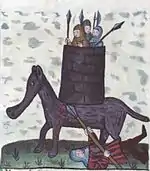In the Judeo-Christian tradition, medieval artists depicted the mutual killing of both Eleazar the Maccabee and a war elephant carrying an important Seleucid general as described in the apocryphal book of 1 Maccabees. The early illustrators knew little of the elephant and their portrayals are highly inaccurate.[12]