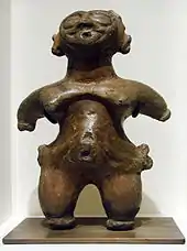 Japan has long had a special regard for the navel. During the early Jōmon period in northern Japan, three small balls indicating the breasts and navel were pasted onto flat clay objects to represent the female body. The navel was exaggerated in size, informed by the belief that the navel symbolizes the center of where life begins. On many middle Jomon figurines, the significance of the navel was emphasized with an indentation or hole. Sometimes, the importance of the navel was further enhanced by connecting with a line from the navel towards the chest.[254] Early Japanese poems feature many references to the female navel. In some, the word navel actually refers to an indentation or hole instead of the belly button.[255][256] The shape of the umbilicus of a newborn baby would be discussed at length. If a baby's navel points downward, the parents would brace themselves for a weakling child who will bring them woe. The thunder god Raijin, with his terrifying drums, great horns, and long tusks, was said to have an insatiable appetite for young navels, and mothers had to nag their youngsters constantly to keep themselves well covered up.[257] Due to the mythology, navel exposure was not encouraged in the earlier times. The traditional clothing of Japanese women has a wide cloth belt around the midriff to protect the belly and keep it warm. The Japanese believe the belly is the source of person's warmth and that the perfect navel is an innie.[258]