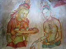 Sigiriya frescoes depict royal ladies wearing cloth draped as a dhoti, tied in a knot at the front and pulled down to expose the navel. They wear pleated robes from the waist upwards, as well a necklace, armlets, wristlets, ear and hair ornaments, and display their breasts. The ladies in waiting wear waist clothes, a few ornaments and a firm thanapatiya ("breast bandage").[267]