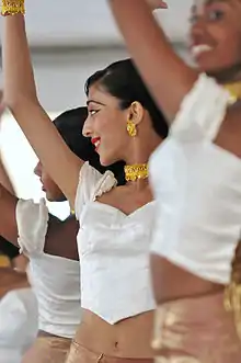 Although women in ancient India wore saris that bared the midriff, the Dharmasastra writers stated that women should be dressed such that the navel was never visible,[128] and navel exposure became taboo.[129] The trend of exposing the navel was started by women who were dancers, acrobats, or entertainers, and who developed a technique of wearing the sari like a pair of trousers well below the navel to assist in the free movement of the legs.[130] Women in this type of attire are very common in many ancient Indian sculptures,[131] and paintings.[132]