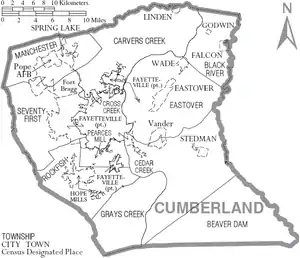 Cumberland County is a county located in the U.S. state of North Carolina. As of the 2020 census, the population was 334,508,[1] making it the fifth-most populous county in North Carolina. Its county seat is Fayetteville.[2] Cumberland County is part of the Fayetteville, NC Metropolitan Statistical Area.