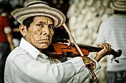 Music of the cumbia is easily recognized by its binary rhythm and short phrases which never descend and finalize, but seem to repeat continuously. As a musical form the cumbia is well-known today because the melodies and rhythm have been adapted to the modern and very popular pindín. In earlier times as violin, guitar, tambor, caja, triangle and maraca or churuca accompanied the cumbia. Today the accordion replaces the stringed instruments in most musical groups.[2]