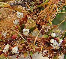 Cuscuta californica is a parasitic vine which climbs other plants and takes nutrition directly from them via a haustorium. The dodder resembles a pile of yellow-orange straw wrapped tightly around its host plant. It is mostly stem; the leaves are reduced to scales on the stem's surface, since they are not needed for photosynthesis while the dodder is obtaining nutrients from its host.