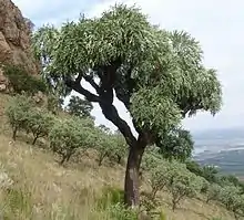 Cussonia paniculata, also known as kiepersol, is a large evergreen shrub or small tree up to 5 metres (16 ft) in height native to South Africa. The plant has large and bold textured grey foliage.