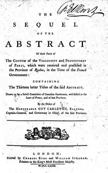 The Custom of Paris (French: Coutume de Paris) was one of France's regional custumals of civil law. It was the law of the land in Paris and the surrounding region in the 16th–18th centuries and was applied to French overseas colonies, including New France.[1] First written in 1507 and revised in 1580 and 1605, the Custom of Paris was a compilation and systematization of Renaissance-era customary law. Divided into 16 sections, it contained 362 articles concerning family and inheritance, property, and debt recovery.[2] It was the main source of law in New France from the earliest settlement, but other provincial customs were sometimes invoked in the early period.