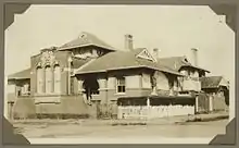 The residence is an asymmetrical two storeyed building, which shares the use of red face brick and rough cast stucco, on a dark brick base, found on the Customs House. It is an asymmetrically arranged building, with a complex roofline comprising many one and two storeyed hipped and gabled sections. A two storeyed verandah lines the north eastern side of the house. The verandah at the lower level is formed by a brick arcade of large round arched openings, and a timber battened balustrade. The residence has a large variety of window openings which contribute to its complex form, including several oculi, grouped lancet type windows with round arched heads and grouped square arched windows. Many of the windows in the house are glazed with pale glazed leadlight panels of regular geometric patterns.[1]