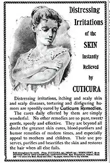 In 1908, the British Medical Journal investigated the advertising of nostrums for the treatment of skin diseases. As reported by the American Medical Association[1] it was implied that Cuticura soap could be effective in the treatment of syphilis when prepared as an internal remedy known as Cuticura Resolvent. The medical community considered the proposed remedy to contain insufficient potassium iodide to be effective in the treatment of the disease.[2]