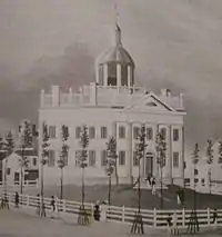 Cuyahoga County was established in 1807 with the county seat still in the air. The county decided to place the temporary county seat in the largest settlement of Cleveland. The courts met in various taverns and inns around town while waiting for the courthouse to be built. This first courthouse was designed and built by Levi Johnson. The building was completed in 1813 and was a simple Federal style stone structure. The structure was five bays wide and two piles deep, with doors located in the center and to the right corner of the facade. A rectangular window was located between these doors with a smaller square window to the left of the central door. Five rectangular windows lit the second floor. The pitched roof was framed by brick chimneys on either end. The clapboard siding was painted red with white trim boards.