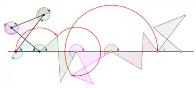 ![]() Animation showing the generation of one arch of a cyclogon by an equilateral triangle as the triangle rolls over a straight line without slipping. | ![]() Animation showing the generation of one arch of a cyclogon by a square as the square rolls over a straight line without slipping. |