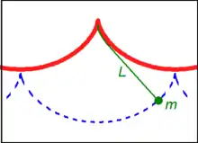If a simple pendulum is suspended from the cusp of an inverted cycloid, such that the string is constrained to be tangent to one of its arches, and the pendulum's length L is equal to that of half the arc length of the cycloid (i.e., twice the diameter of the generating circle, L = 4r), the bob of the pendulum also traces a cycloid path. Such a pendulum is isochronous, with equal-time swings regardless of amplitude. Introducing a coordinate system centred in the position of the cusp, the equation of motion is given by: