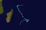 There were six storms named by the weather service in Madagascar or Mauritius, with advisories issued by Météo-France's meteorological office at Réunion (MFR).[1] At the time, the MFR area of warning responsibility was from the coast of Africa to 80° E, and the agency primarily used the Dvorak technique to estimate the intensities of tropical cyclones.[4] The Joint Typhoon Warning Center (JTWC), which is a joint United States Navy – United States Air Force task force that issues tropical cyclone warnings for the region,[5] also tracked a short-lived tropical storm in February, which formed on February 5 northeast of Mauritius. The system tracked to the southeast, reaching peak winds of 65 km/h (40 mph) before dissipating on February 8 northwest of Rodrigues.[6]