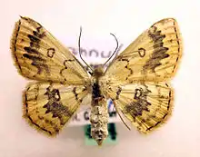 Its wingspan is 18 to 22 millimetres (0.71 to 0.87 in). Normally, the wings of this species are yellowish white, inclining to ochreous yellow with the blackish central shade near to and sometimes united with the blackish irregular and outwardly toothed second cross line on both fore and hind wings.The rings are deep brown or blackish. There is variation in the width and intensity of the central shade, and the rings sometimes are absent on the fore wings (ab. obsoleta, Riding), and occasionally all the wings are devoid of the annular mark (ab. biobsoleta, Riding). Examples of a second generation reared in captivity are rather deeper coloured, and have a sprinkling of black scales, chiefly on the fore wings.
