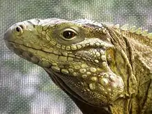 Cyclura nubila caymanensis is a medium to large lizard with an average total length between 30 and 40 inches.[11] Like other Cyclura, it is sexually dimorphic; males are larger than females.[12] The males also have more prominent dorsal crests and larger femoral pores on their thighs, which are used to release pheromones.[13]