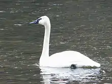 The adult trumpeter swan's plumage is entirely white. Like mute swan cygnets, the cygnets of the trumpeter swan have light grey plumage and pinkish legs, gaining their white plumage after about a year. As with the whooper swan, this species has upright posture and generally swims with a straight neck. The trumpeter swan has a large, wedge-shaped black bill that can, in some cases, be minimally lined with salmon-pink coloration around the mouth. The bill, measuring 10.5–12 cm (4.1–4.7 in), is up to twice the length of a Canada goose's (Branta canadensis) bill and is the largest of any waterfowl. The legs are gray-pink in color, though in some birds can appear yellowish gray to even black. The tarsus measures 10.5–12 cm (4.1–4.7 in). The mute swan, introduced to North America, is scarcely smaller. However, it can easily be distinguished by its orange bill and different physical structure (particularly the neck, which is typically held curved as opposed to straight in the trumpeter). The mute swan is often found year-around in developed areas near human habitation in North America, whereas trumpeters are usually only found in pristine wetlands with minimal human disturbance, especially while breeding.[2] The tundra swan (C. columbianus) more closely resembles the trumpeter, but is significantly smaller. The neck of a male trumpeter may be twice as long as the neck of a tundra swan.[2] The tundra swan can be further distinguished by its yellow lores. However, some trumpeter swans have yellow lores; many of these individuals appear to be leucistic and have paler legs than typical trumpeters.[17] Distinguishing tundra and trumpeter swans from a distance (when size is harder to gauge) can be challenging without direct comparison but it is possible thanks to the trumpeter's obviously longer neck (the great length of which is apparent even when the swan is not standing or swimming upright) and larger, wedge-shaped bill as compared to the tundra swan.