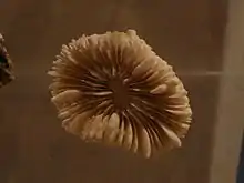 Cynarina lacrymalis is a species of stony coral in the family Lobophylliidae. It is variously known as the flat cup coral, solitary cup coral, button coral, doughnut coral, or cat's eye coral. It is found in the western Indo-Pacific Ocean and is sometimes kept in reef aquaria.