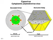 Cypovirus, short for cytoplasmic polyhedrosis virus, is a genus of double-stranded RNA viruses in the family Reoviridae and subfamily Spinareovirinae. Cypoviruses have only been isolated from insects. Diseases associated with this genus include chronic diarrhoea and pale blue iridescence in the guts of larvae.[1] Sixteen species are placed in this genus.[2][3]