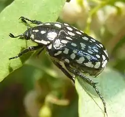 Cyrtothyrea is a small genus of Afrotropical chafer beetles (Cetoniinae). They are about 9 mm in size, black in colour with white dots or lines on the thorax, elytra and abdomen. Each species has its own distinctive pattern. Cyrtothyrea are active during the day, and are often found on flowers, while feeding on nectar. They are pollinators of several plant groups, including lily,[1] orchid,[2] protea[3] and asclepiad species.[4] In the case of Lilium formosanum, C. marginalis beetles feed on the anthers or force themselves deep down into the perianth tubes to feed on nectar. At times they contact the stigma, which may also be used as a launch pad for taking off.[1]