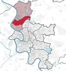 map of Düsseldorf, showing Lohausen (in red) within District 5 (in pink)